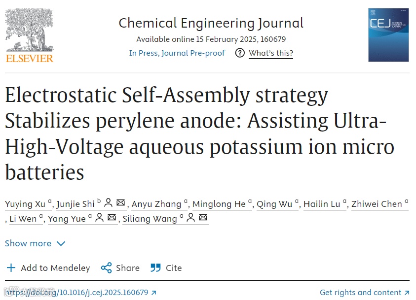 Electrostatic Self-Assembly Strategy Stabilizes Perylene anode: Assisting Ultra-High-Voltage Aqueous Potassium Ion Micro BatteriesYuying Xua , Junjie Shib,* , Anyu Zhanga , Minglong Hea , Qing Wua , Hailin Lua , Zhiwei Chena , Li Wena , Yang Yuea,* , and Siliang Wang a,*