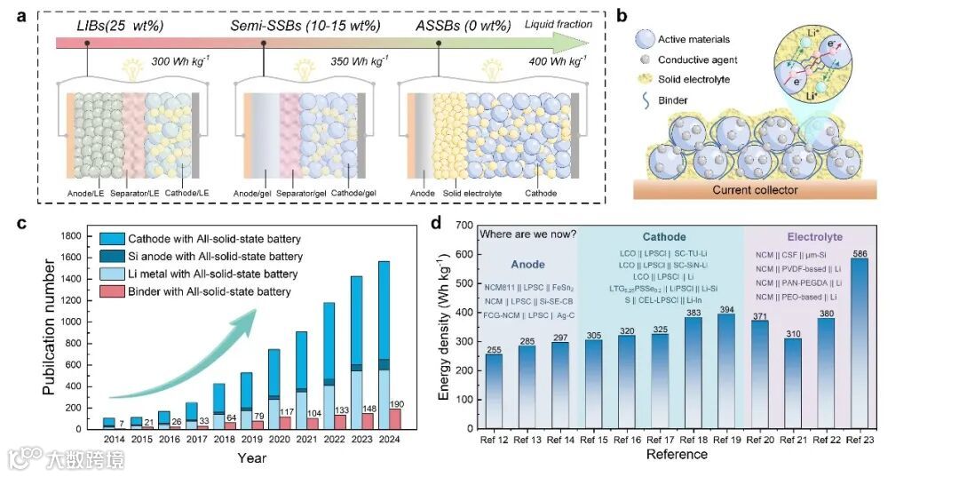 图1. ASSB 和 binders 的广泛概念。a) 锂离子电池、半固态电池和全固态电池的配置。b) 多孔电极中材料之间理想连接状态的示意图。c) 关于“全固态电池和全固态电池粘结剂”的学术出版物数量。d) 已发表的电池级 ASSB 的能量密度性能。
