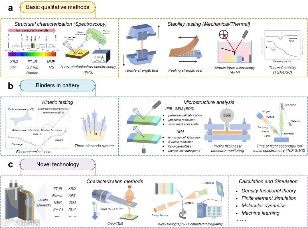 为了充分利用粘合剂在ASSB中的先进作用,利用一系列关键的表征和测试技术对粘合剂进行性能评估和机制分析至关重要。粘合剂的物理化学性质和功能设计对ASSB的性能有重大影响,需要探究其基本物理化学性质和作用机制。通过详细的表征,可以全面了解电极的结构、性能和失效机制,为开发新的电池材料和粘合剂提供有价值的见解。