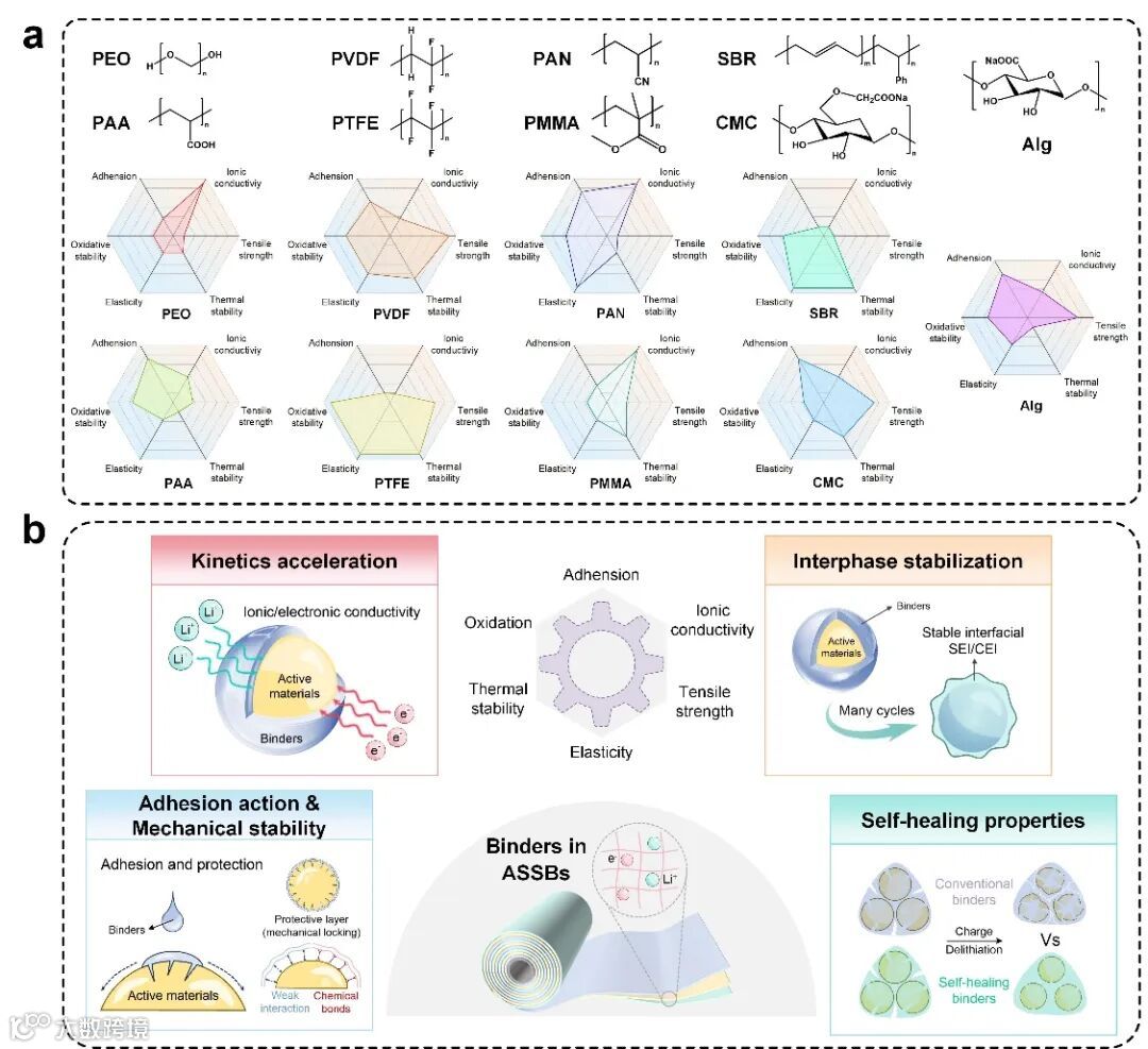 图3. ASSB 中使用的粘合剂。a) ASSB 中常用的常规粘合剂的性能比较,即 PEO、PVDF、PAN、SBR、PAA、PTFE、PMMA、CMC 和海藻酸盐。b) ASSB 中使用的粘合剂的预期功能,包括粘附力和机械稳定性、加速动力学、界面稳定性和自修复性能。