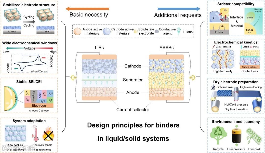 图2. 液体 LIB 和 ASSB 中粘合剂的设计原则。对于常规 LIBs 中粘合剂的设计,主要考虑电极结构稳定性、宽电化学窗口、稳定的 SEI/CEI 界面和液态系统的适用性。对于 ASSB 的设计,提出了更高的要求,包括更严格的兼容性、载流子传输、干电极制备和经济环保性。