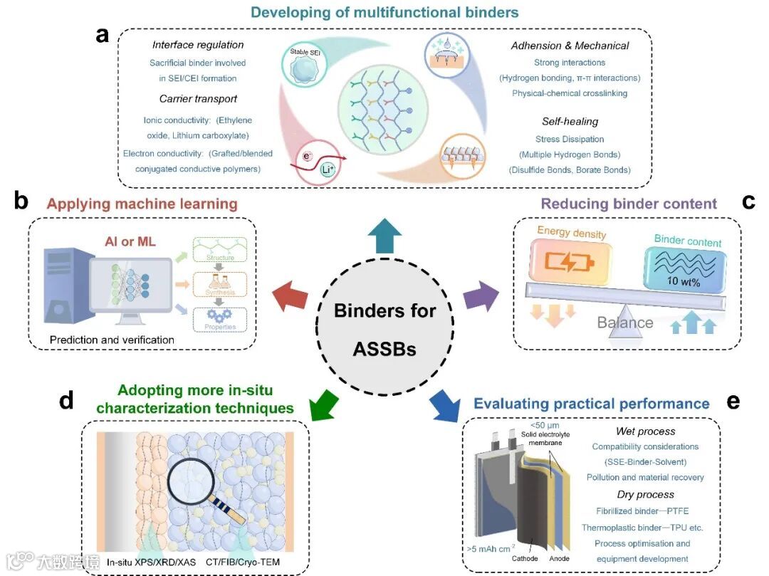 图5. ASSB 粘合剂的前景。包括探索新型多功能集成粘合剂、人工智能与机器学习的应用、电极制备工艺的改进、更加先进的原位表征技术、开发实际工况下的适配性粘结剂。