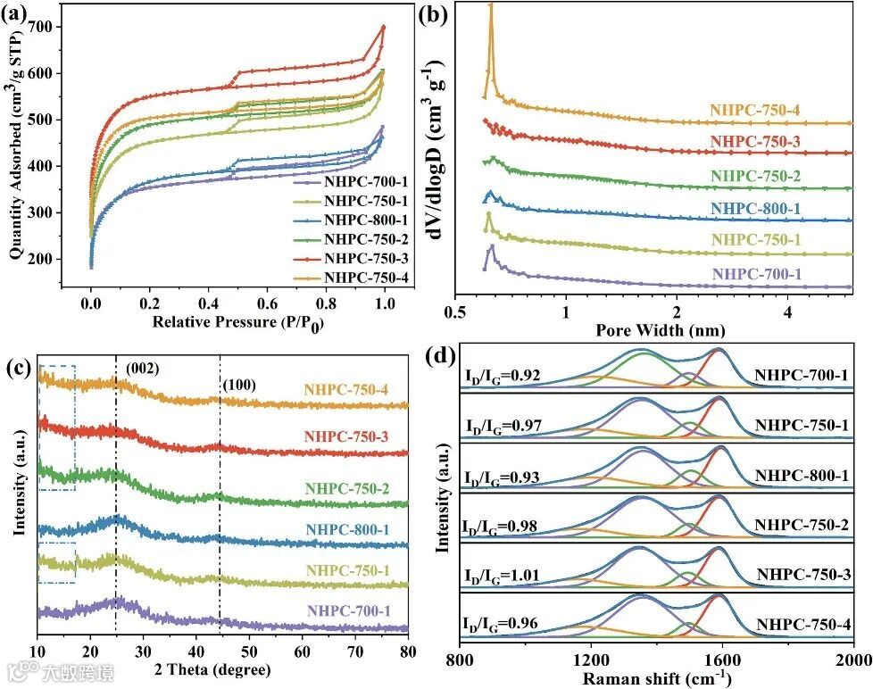 通过BET分析揭示了尿素辅助柠檬酸钾活化对多孔碳材料孔隙结构的调控规律。当活化温度从700 °C升至750 °C时,K2CO3分解产生的CO气体促使微孔大量形成,使比表面积达到1445.58 m²/g的峰值;但温度继续升高至800 °C会导致孔结构坍塌。同样,柠檬酸钾浸渍比存在最优值(NHPC-750-3),既保证了丰富的活性位点,又维持了结构稳定性。XRD和拉曼光谱分析揭示了孔隙调控的深层机制——随着柠檬酸钾比例增加,(002)峰减弱且ID/IG比值升高,表明通过调节活化剂用量可精确控制材料的石墨化程度和缺陷密度。这种多级孔结构与适度缺陷的协同作用,使材料在保持结构完整性的同时,展现出优异的电化学性能。