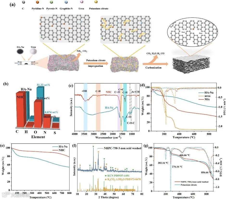 图 1. NHPC-T-X 的合成过程(a)、元素分析(b)、傅立叶变换红外光谱(c)、尿素、HA-Na和Mix的TG和DTG曲线(d)、NHC和HA-Na的TG曲线(e)、XRD图像(f)、柠檬酸钾和未酸洗NHPC-750-3的TG和DTG曲线(g)