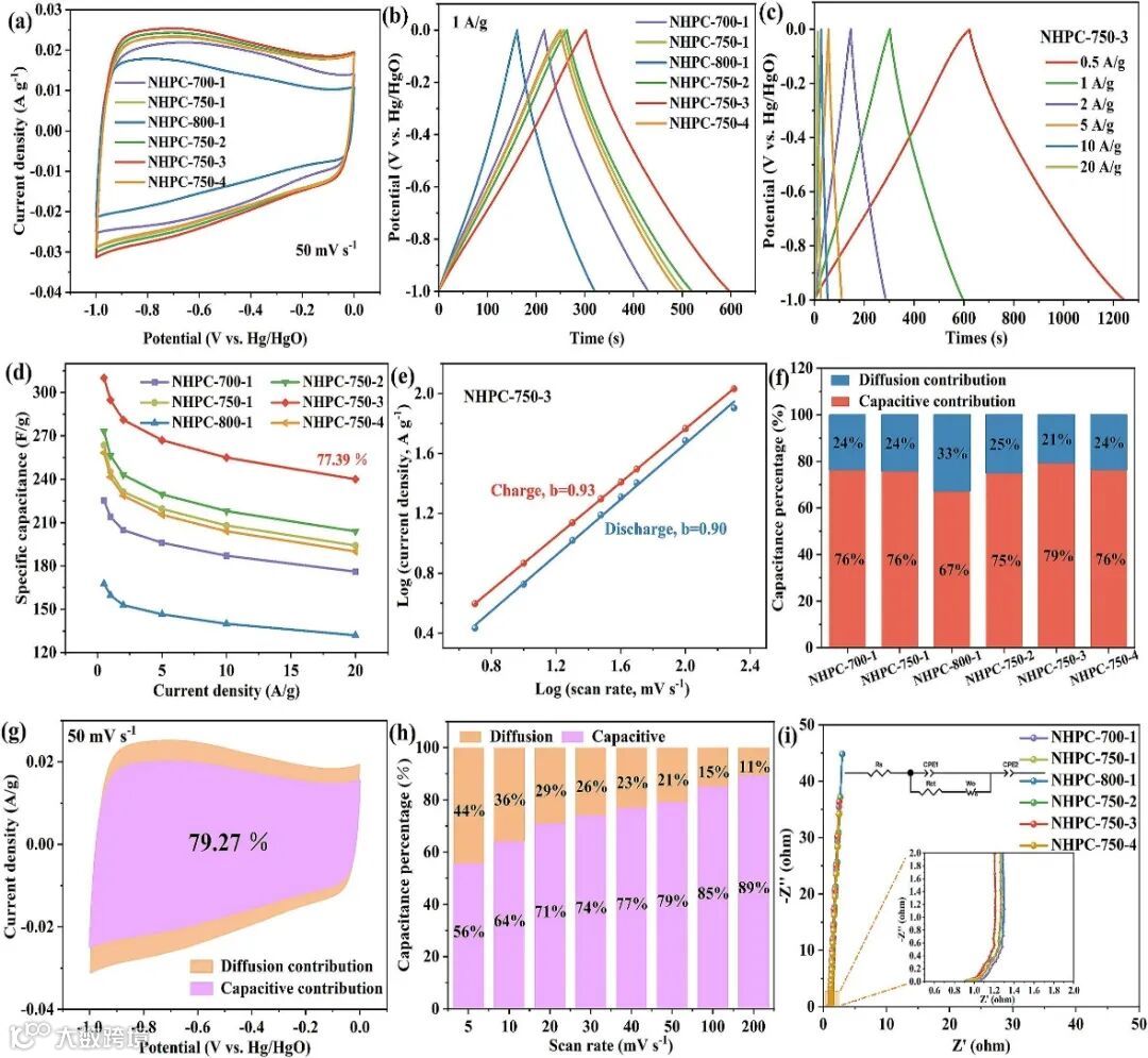 图 4. NHPC-T-X的CV曲线(a)和GCD曲线(b)、NHPC-750-3在0.5 A/g-20 A/g时的GCD曲线(c)、NHPC-T-X的速率性能(d)、log(i) vs. log(v)的拟合线(e)、NHPC-T-X的扩散和电容贡献(f, g)、NHPC-750-3 在 5 mV/s-200 mV/s 时的扩散和电容贡献(h)、NHPC-T-X的奈奎斯特图(i)