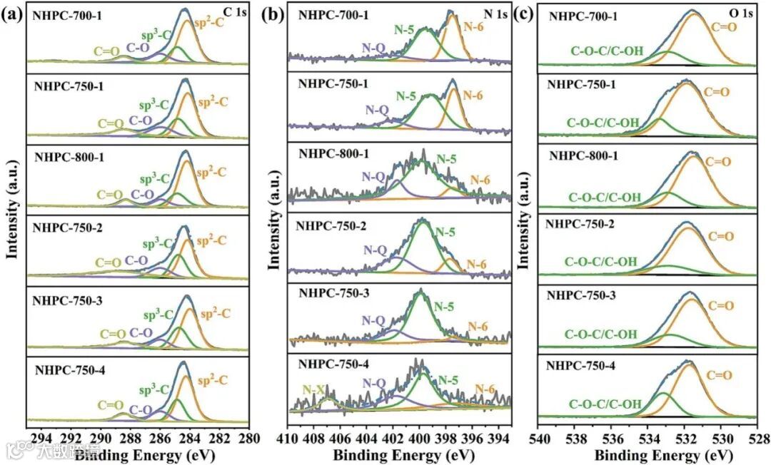 图 3. NHPC-T-X的XPS C 1s 光谱(a)、N 1s光谱(b)和O 1s光谱(c)