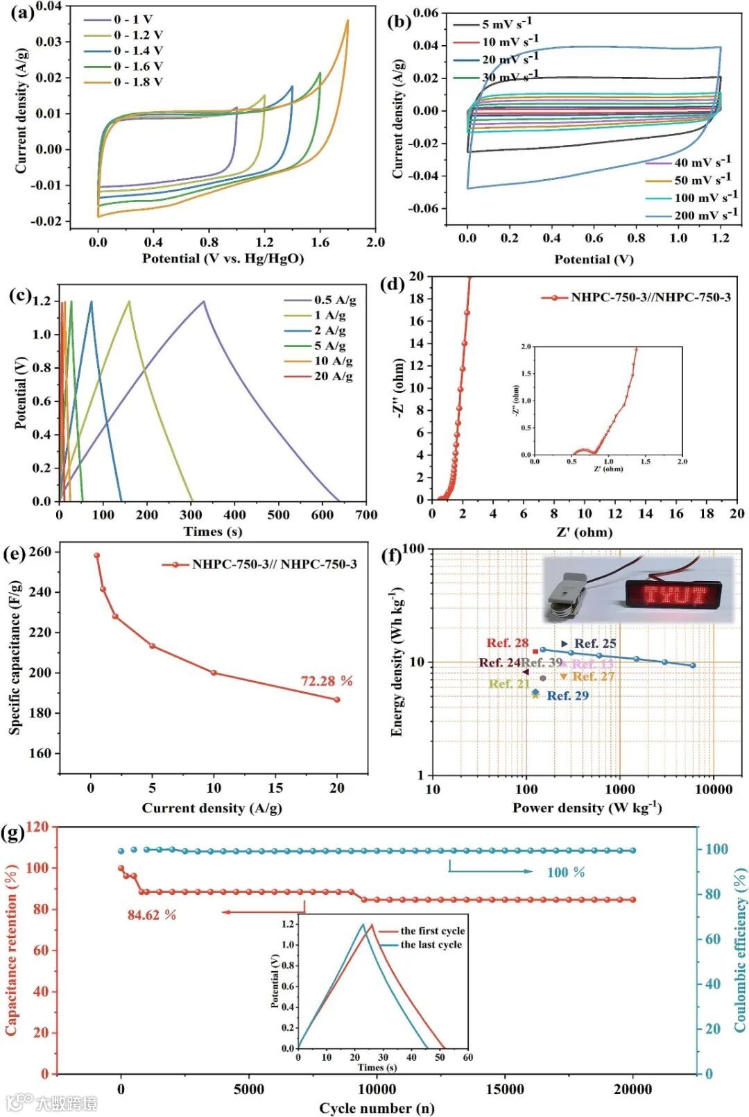 图 5. NHPC-750-3//NHPC-750-3 在 50 mV s-1下从0-1到0-1.8 V的CV曲线(a)、5 mV/s-200 mV/s的CV曲线(b)、0.5 A/g-20 A/g 的GCD曲线(c)、Nyquist图(d)、倍率性能(e)、Ragone图(f)、循环稳定性(g)