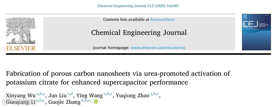 基于此,来自太原理工大学的张国杰教授,在国际知名期刊Chemical Engineering Journal上发表题为“Fabrication of Porous Carbon Nanosheets via Urea-Promoted Activation of Potassium Citrate for Enhanced Supercapacitor Performance”的观点文章。该观点文章通过两步热解法制备了富含N、O原子的多孔碳纳米片,作为超级电容器电极材料时展现了优异的电化学性能。