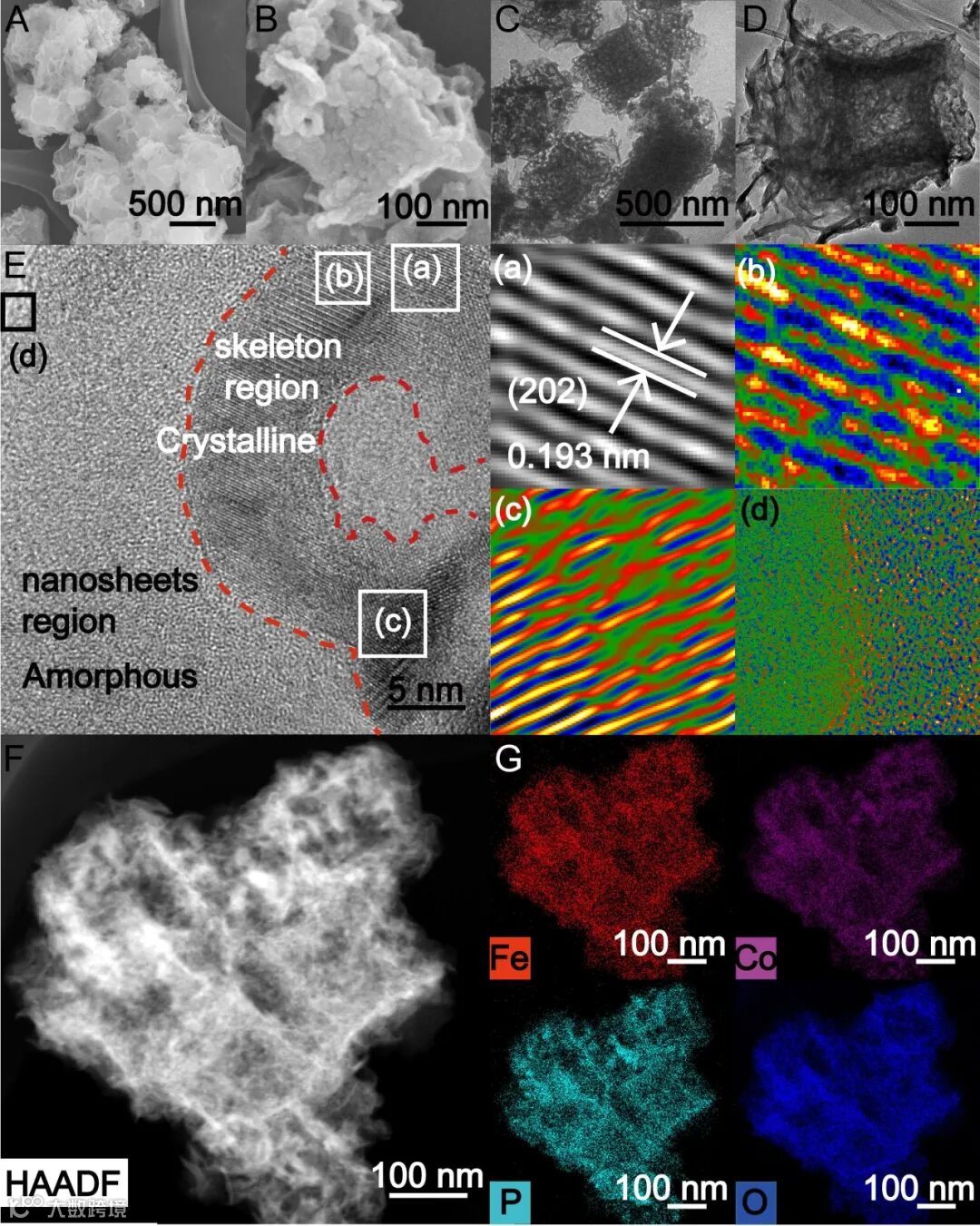Figure 2. A-B) Low- (A) and high- (B) magnification FE-SEM images of Co0.7-xFe0.3-yP/ CoxFeyOOH NHFs. C-D) Low- (C) and high- (D) magnification TEM images of Co0.7-xFe0.3-yP/CoxFeyOOH NHFs. E-G) The HRTEM and false-color inverse FFT images (E), HAADF-STEM image (F) and elemental mapping patterns (G) for Co0.7-xFe0.3-yP/CoxFeyOOH NHFs.