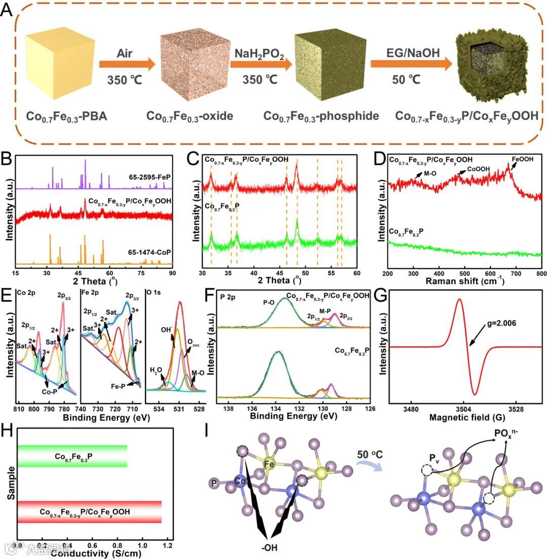 Figure 1. A) The schematic procedures on synthesis of Co0.7-xFe0.3-yP/CoxFeyOOH NHFs. B) The XRD pattern of Co0.7-xFe0.3-yP/CoxFeyOOH NHFs. C-D) Comparing the XRD patterns (C) and Raman spectra (D) of Co0.7-xFe0.3-yP/CoxFeyOOH NHFs and Co0.7Fe0.3P. E) The fine Co 2p, Fe 2p and O 1s XPS spectra for Co0.7-xFe0.3-yP/CoxFeyOOH NHFs. F) Comparing the fine P 2p XPS spectra of Co0.7-xFe0.3-yP/CoxFeyOOH NHFs and Co0.7Fe0.3P. G) EPR spectra of Co0.7-xFe0.3-yP/CoxFeyOOH NHFs. H) Electrical conductivity for Co0.7-xFe0.3-yP/CoxFeyOOH NHFs and Co0.7Fe0.3P. I) The schematic illustration on formation of phosphorus vacancy.
