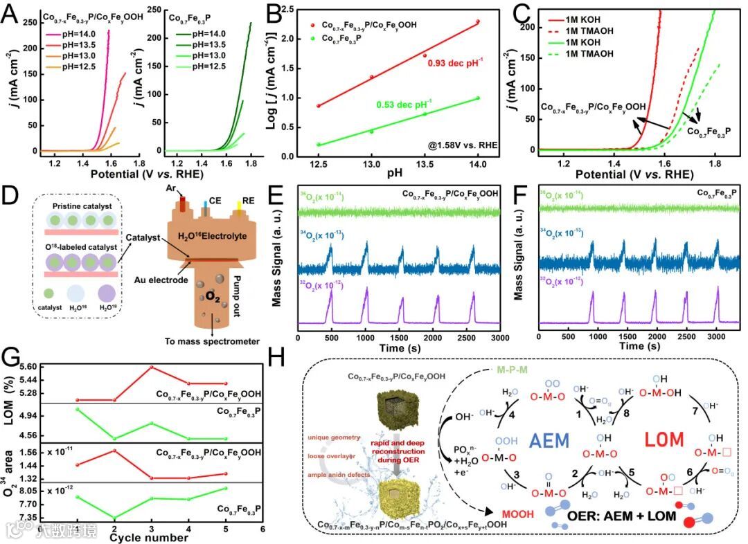 通过PH依赖实验、四甲基氢氧化铵(TMAOH)探针反应和18O同位素标记的原位电化学差分质谱(DEMS)测试证实Co0.7-xFe0.3-yP/CoxFeyOOH在OER过程存在晶格氧的参与,并与AEM机制偶联,协同促进OER发生。其中,非晶相CoxFeyOOH外壳与原位形成的阴离子缺陷一方面共同调节Co0.7-xFe0.3-yP/CoxFeyOOH的电子状态,优化AEM路径中反应中间体的吸附行为。另一方面,非晶相的亚稳态可刺激催化剂自适应重构,丰富的阴离子缺陷有助于活性氧演变,从而触发晶格氧参与反应(LOM)。