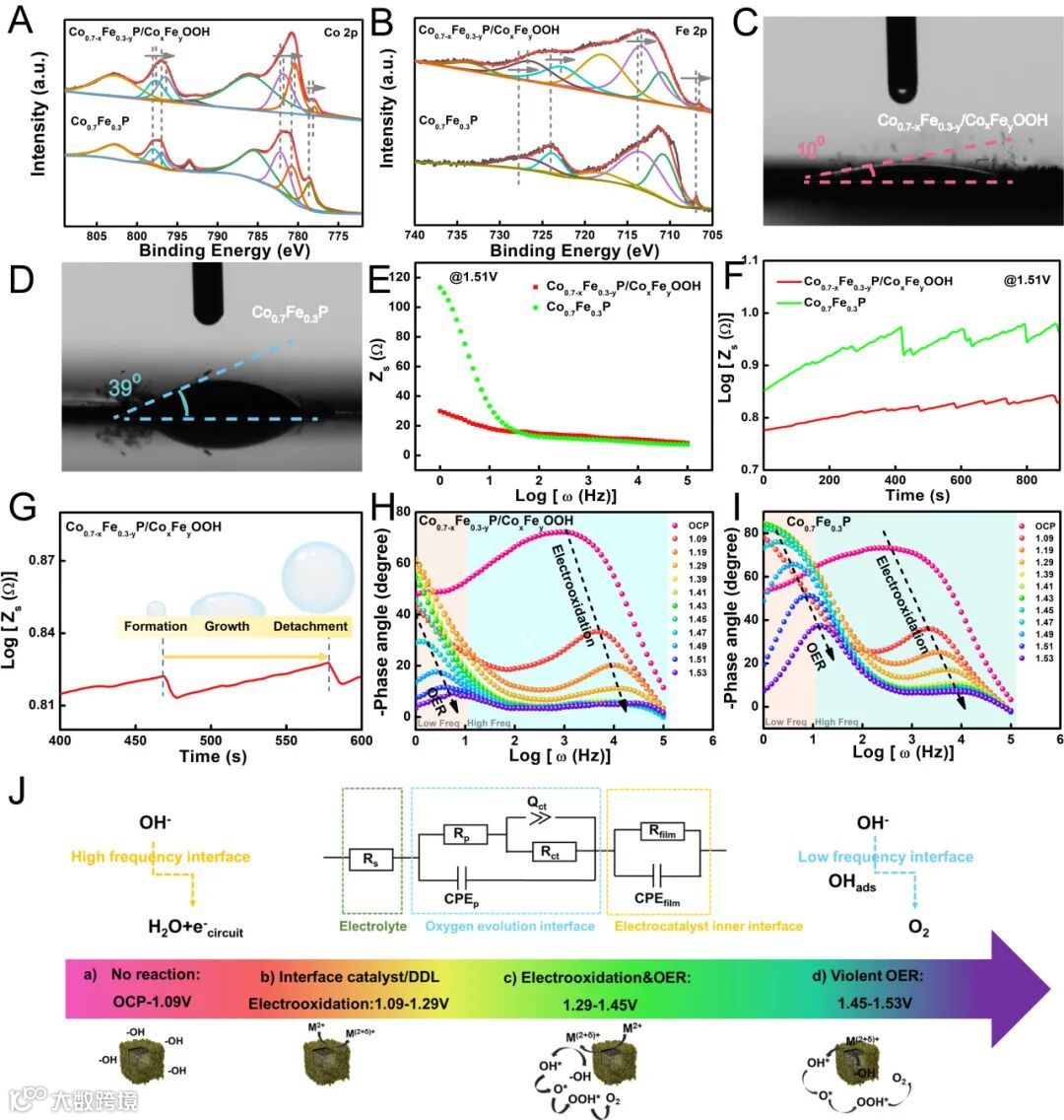 通过XPS表征,证实Co0.7-xFe0.3-yP、CoxFeyOOH两相之间存在有效的电子耦合行为,有助于提高反应动力学。水接触角和EIS测试证实Co0.7-xFe0.3-yP/CoxFeyOOH具有亲水疏气表面,有助于水分子在催化剂表面的活化、电解质的渗透、反应中间体的吸附和O2产物的脱附,从而促进电极/电解质界面的传质和电荷转移。同时,通过Bode曲线证实Co0.7-xFe0.3-yP/ CoxFeyOOH具有更快的界面电荷转移和重构行为。