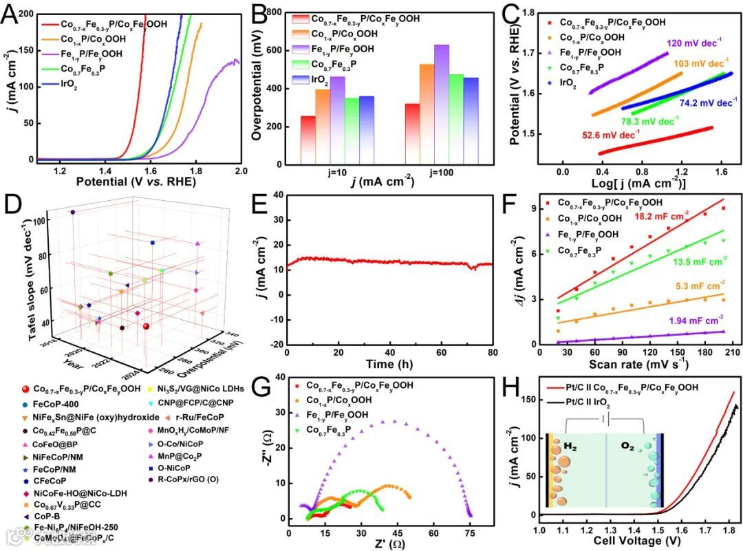 通过电化学测试,证实Co0.7-xFe0.3-yP/CoxFeyOOH具有良好的OER活性,在电流密度为10 mA cm-2时,其过电势仅为256mV,优于许多报道的TMPs-基OER电催化剂。同时,Co0.7-xFe0.3-yP/CoxFeyOOH还具有出色的反应动力学、优异的稳定性和较大的电化学活性面积。此外,将Co0.7-xFe0.3-yP/CoxFeyOOH作为阳极与Pt/C配对应用于全解水时,仅需1.56V的池电压即可驱动全解水达到10 mA cm-2电流密度。