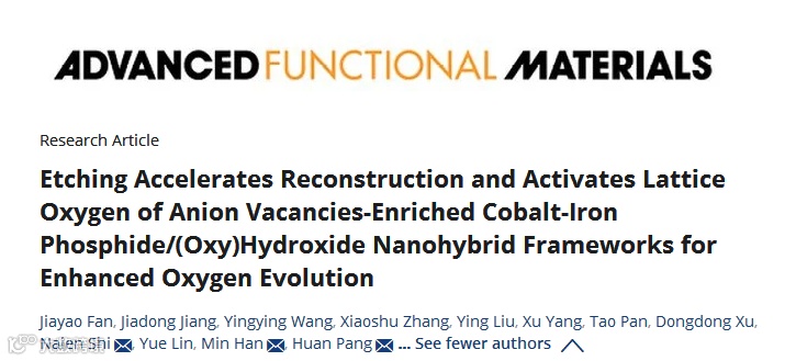 针对上述问题,福建师范大学韩敏教授团队与扬州大学庞欢教授团队合作,提出了一种简单而有效的电催化剂设计策略:通过碱性刻蚀,在结晶性良好的Co0.7Fe0.3P纳米立方体上原位生长非晶CoxFeyOOH纳米片亚单元,构筑了结晶/非晶Co0.7-xFe0.3-yP/CoxFeyOOH异相纳米杂化核壳结构。由于其独特的几何结构,致密的结晶/非晶界面以及Co0.7-xFe0.3-yP、CoxFeyOOH两相之间有效的电子耦合,可优化催化剂表面亲水性,反应界面传质过程和对反应中间体的吸脱附,导致所得Co0.7-xFe0.3-yP/CoxFeyOOH表现出优异的电催化OER活性和稳定性,超越了许多报道的TMPs电催化剂。一系列的原位和非原位光谱表征及系统的电化学分析表明P和O双阴离子缺陷及非晶相的生成促进了Co0.7-xFe0.3-yP/CoxFeyOOH在OER过程中快速和深度重构,从而触发晶格氧氧化机制(LOM)参与,导致其OER机制遵循“LOM+AEM(传统的吸附机制途径)”途径,从而实现了活性和稳定性的权衡。该工作通过简单的刻蚀技术有效耦合结构、缺陷和相工程策略,为未来设计TMPs-基OER电催化剂,并用于水分解制绿氢或其它清洁能源体系提供了新思路。