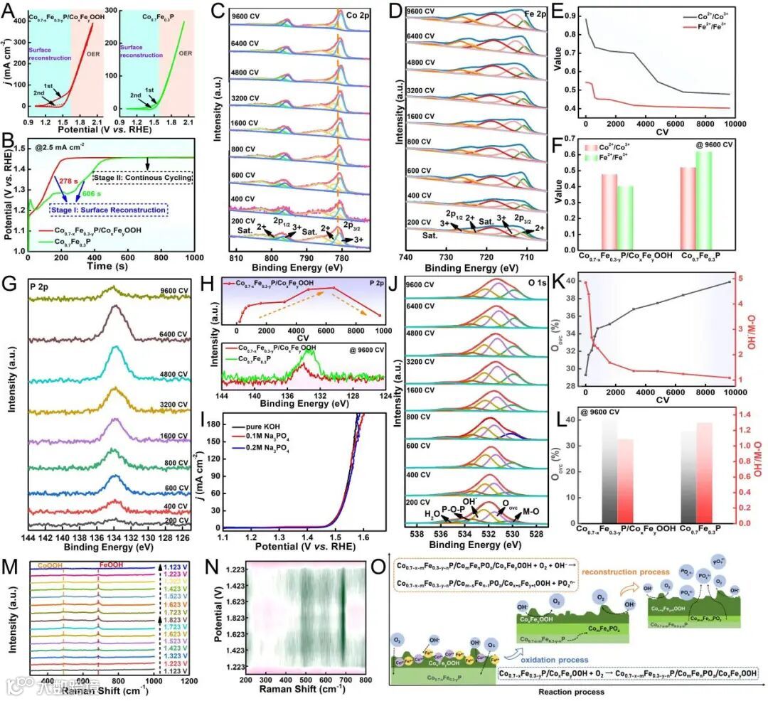 Figure 5. A-B) The first and second CV curves (A) and time-dependent potential plots (B) of Co0.7-xFe0.3-yP/CoxFeyOOH NHFs and Co0.7Fe0.3P. C-D) CV cycles dependent Co 2p (C) and Fe 2p (D) XPS spectra of Co0.7-xFe0.3-yP/CoxFeyOOH NHFs. E-F) The related Co2+/Co3+ and Fe2+/Fe3+ ratios evolution curves (E), and histograms on Co2+/Co3+ and Fe2+/Fe3+ ratios after 9600 CV cycles (F) for Co0.7-xFe0.3-yP/CoxFeyOOH NHFs and Co0.7Fe0.3P. G-H) CV cycles dependent P 2p spectra for Co0.7-xFe0.3-yP/CoxFeyOOH NHFs (G), and comparing their P 2p peak intensity with Co0.7Fe0.3P after 9600 CV cycles (H). I) OER polarization curves of Co0.7-xFe0.3-yP/CoxFeyOOH NHFs in 1 M KOH with different concentrations of PO43-. J-L) CV cycles dependent O 1s spectra (J), Oovc content and OH-/M-O ratios evolution plots (K), and histograms on Oovc content and OH-/M-O ratio after 9600 CV cycles (L) for Co0.7-xFe0.3-yP/CoxFeyOOH NHFs. M-N) Operando electrochemical Raman spectra (M) and contour map (N) of Co0.7-xFe0.3-yP/CoxFeyOOH NHFs. O) Schematic diagram on illustrating the evolution of Co0.7-xFe0.3-yP/CoxFeyOOH NHFs during OER in 1.0 M KOH media
