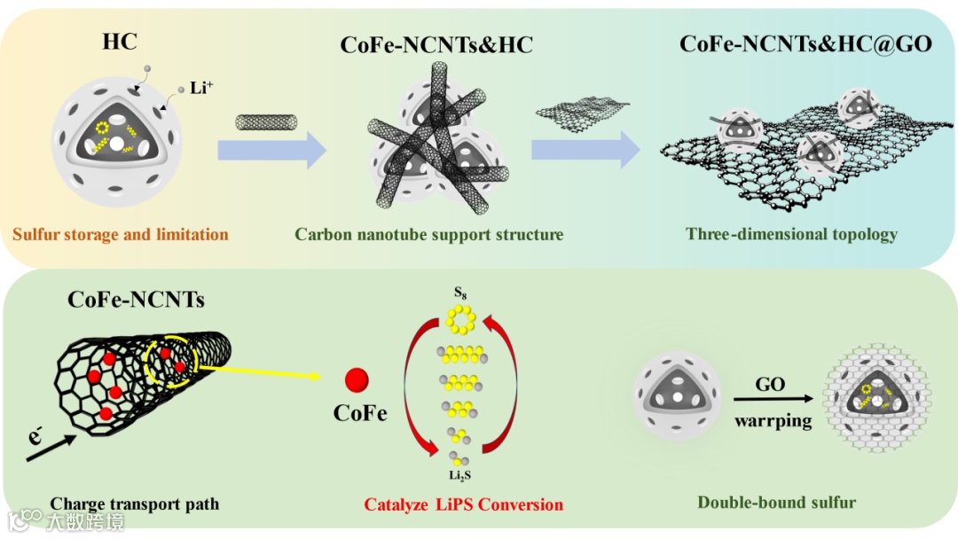 本研究开发了一种基于拓扑结构的设计方法对碳材料整体结构进行优化,提高碳材料整体结构稳定性以及导电性。通过将具备三维拓扑碳材料结构的钴铁合金&碳管@氮掺杂多级孔碳@氧化石墨烯碳基体材料应用于LSBs电池,显著增强了LSBs中硫阴极的氧化还原动力学。