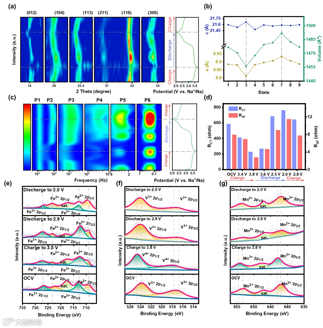 使用非原位XRD表征了材料的结构演变机理,结果表明在3.8 V时出现两相反应,对应V、Mn元素的价态变化带来的晶体结构变化;在2.5 V主要表现为固溶反应,对应Fe的氧化还原过程。使用弛豫时间分布(DRT)方法分析了原位EIS的阻抗谱,评估了充放电过程中各频率阻抗的变化情况。XPS分析结果验证了不同电压下各电化学活性元素的价态状况。