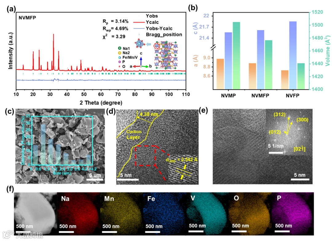 使用常规溶胶凝胶法合成了Na11/3(V,Mn,Fe)2/3(PO4)3正极材料,基本结构形貌表征如图2所示。XRD主要衍射峰与NASICON结构R-3c空间群一一对应,证明该材料属于NASICON三维框架结构。相较于对照组Na3VFe(PO4)3 (NVFP)和Na4VMn(PO4)3 (NVMP),Na11/3(V,Mn,Fe)2/3(PO4)3(NVMFP)晶胞参数位于二者之间,符合元素取代的物理规律。使用SEM拍摄其粉末颗粒形貌,表现为不规则的颗粒,粒径集中分布在0.6—1.8 µm范围内。单个颗粒的高分辨TEM表明材料表面包覆了碳层,有助于改善聚阴离子类材料的电子电导率差的问题;颗粒内部晶格条纹符合标准Na3V2(PO4)3的晶面间距,同样印证了材料的晶体结构。EDS能谱Mapping结果表明材料内部各主要元素均匀分布,无偏聚现象。
