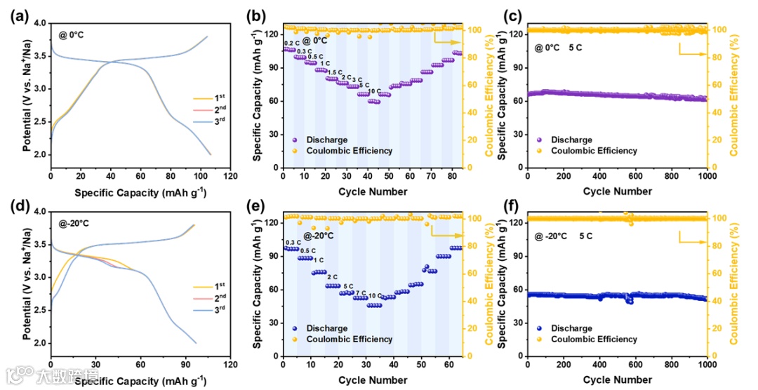 为探究ME-NVMFP对低温环境的耐受能力,对其0℃和-20℃的电化学性能进行了评估,如图4所示。在0℃ 0.2 C倍率下,ME-NVMFP可以释放106.8 mAh g-1的比容量,相当于常温环境下的95.4%;温度降低至-20℃时,容量为常温容量的87.1%。此外,材料表现出较好的倍率性能以及高倍率循环稳定性,在5 C甚至10 C倍率循环千圈后容量保持率超过90%,验证了该材料的低温应用潜力。
