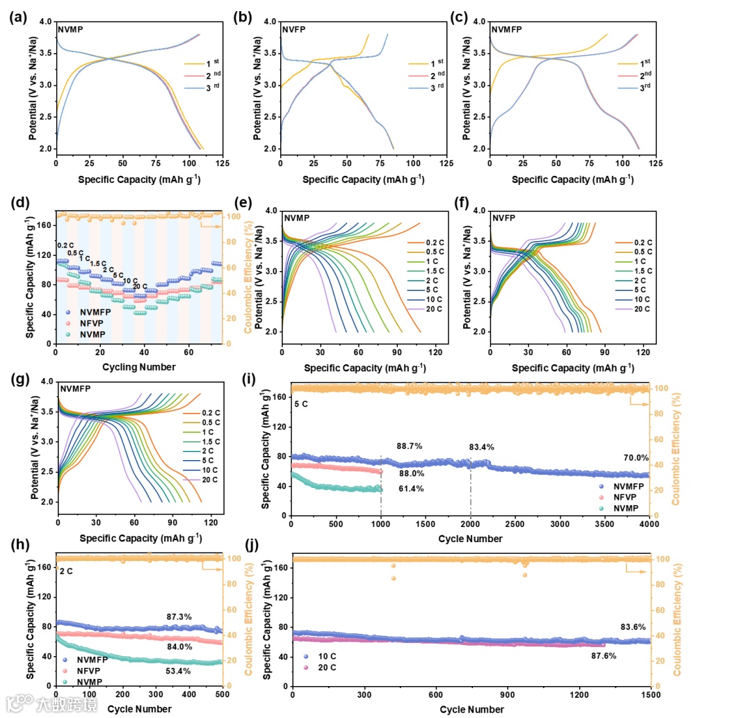 图3. ME-NVMFP和对照组NVMP、NVFP的充放电曲线、倍率性能和循环性能评估。