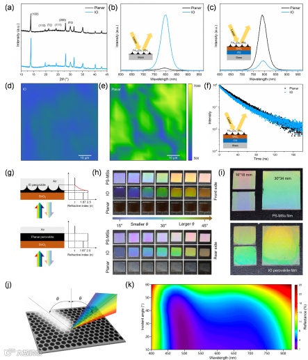 图4. (a) 平板和IO钙钛矿薄膜XRD表征;(b) 玻璃基底和(c)SnO2基底上的光致发光(PL)光谱;(d, e) PL 强度mapping;(f) 瞬态荧光光谱;(g) 折射率分布示意图;(h) 聚苯乙烯模板、平板和IO钙钛矿薄膜在不同观察角度下的数码照片及(i)大尺寸下的虹彩效果实物图;角分辨反射光谱(j)测试装置示意图及(k)不同入射角下的反射光谱。