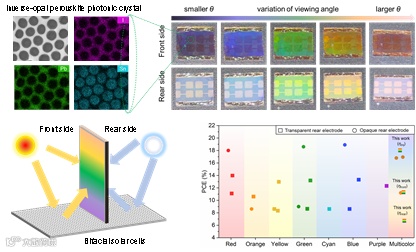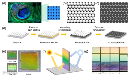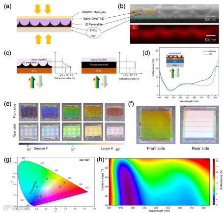 纳米结构引起的可视化色彩广泛存在于大自然当中,比如孔雀羽毛中存在的周期性纳米结构的光子晶体可以对光产生强烈的干涉效果,使其在光照下展现出鲜艳的结构色彩。人工制备的蛋白石和反蛋白结构同样具有周期性的纳米结构,能够对光进行可控调制,实现虹彩效果。黄建媚团队成功制备出具有反蛋白石结构的钙钛矿(IO钙钛矿)薄膜,并结合ITO正面透明电极和超薄Au背面透明电极,设计出了能够从正反两面同时吸收光照的双面太阳能电池,从而实现高效率,同时该电池可以在正反两面展现虹彩效果,大大拓展了太阳能电池在BIPV、汽车天窗等多功能发电系统中的适用性。