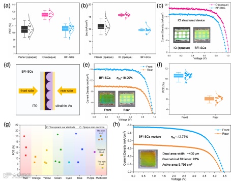 图6. 电池器件(a)效率及(b)短路电流密度统计分布;(c)非透明背电极及透明背电极的IO 钙钛矿太阳能电池J-V曲线;(d) 双面虹彩太阳能电池光照示意图;双面虹彩太阳能电池正面和背面光照下的(e)J-V曲线及(f)效率统计分布;(g) 单色和多彩(或虹彩)太阳能电池效率对比;(h) 双面虹彩太阳能电池组件正面和背面光照下的J-V曲线。