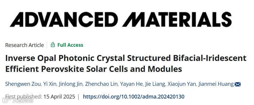 基于此,北京航空航天大学黄建媚团队,受孔雀羽毛光子晶体结构色的启发,利用人工反蛋白石光子晶体结构化的钙钛矿薄膜制备出具有鲜艳虹彩效果的太阳能电池,同时基于正反两面双向透明电极的设计,实现了虹彩效果的双向展示和双面光吸收能力,显著提升了电池的美学效果和功率输出密度。相关研究工作以“Inverse Opal Photonic Crystal Structured Bifacial-Iridescent Efficient Perovskite Solar Cells and Modules”为题发表在《AM》期刊