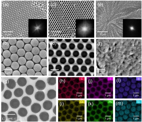 图3. (a, b) 聚苯乙烯蛋白石模板、(c, d) 反蛋白石钙钛矿薄膜及(e, f)普通平板钙钛矿薄膜扫描电镜图像;(g-m) 反蛋白石钙钛矿薄膜元素分布。