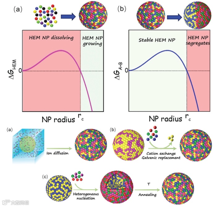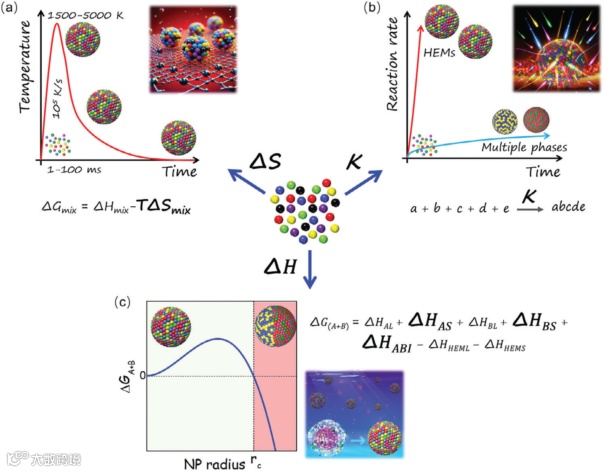 图:高熵纳米材料焓驱动自由能变化及合成方法。