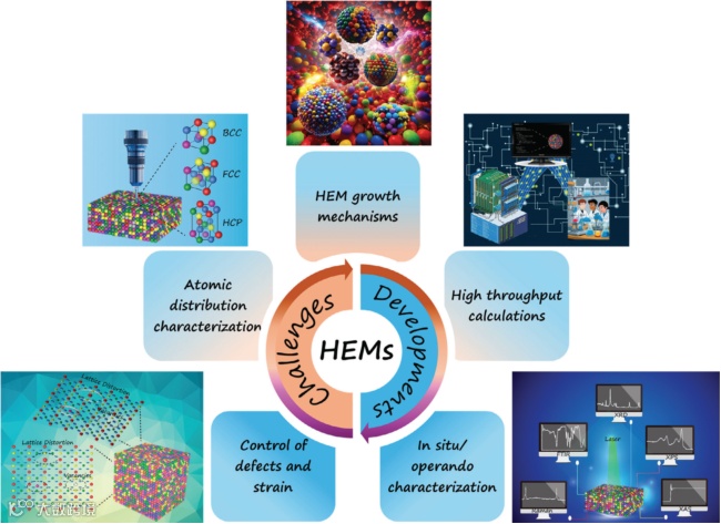 最后,文章强调了未来的研究方向,以加深对HEM形成机制、特性和性能的理解,并拓展其应用。这些研究方向包括在原子尺度上加深对HEMs的理解;控制HEMs生长过程中的缺陷和应力;原位监测合成过程以实现稳定的HEMs纳米粒子;分析生长机制;以及利用高通量计算技术来筛选各种可能的HEMs以满足各种功能特性。