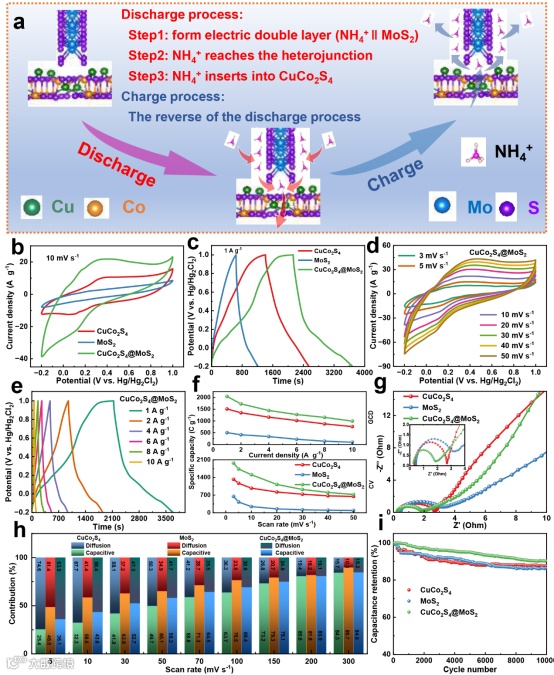 图4. 各种电极材料的电化学性能。(a)CuCo2S4@MoS2电极中NH4+离子转移示意图;(b)10 mv s-1时的CV曲线;(c)1 A g-1的GCD曲线;(d, e)CV曲线和GCD曲线;(f)比容量随扫速和电流密度变化的关系曲线图;(g)阻抗图;(h)电容控制与扩散控制之间的变化;(i)10 A g-1下的循环性能。