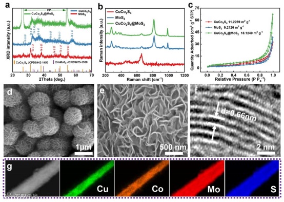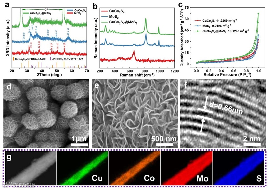 图2. CuCo2S4@MoS2的微观结构和微观形貌。(a)XRD图谱;(b)拉曼光谱;(c) N2吸附-解吸等温线;(d-e) SEM图像;(f)壳层MoS2的TEM图像;(g) EDX图像:Cu(绿色),Co(橙色),Mo(红色),S(蓝色)。