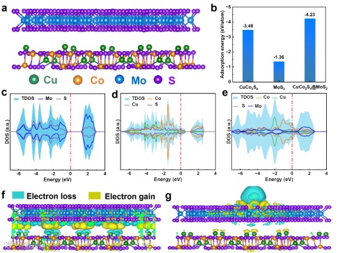 图6. 理论计算。(a)CuCo2S4@MoS2模型;(b)吸附能;(c-e)MoS2、CuCo2S4和CuCo2S4@MoS2的DOS;(f, g)CuCo2S4@MoS2在原始和NH4+吸附中的电荷分布。