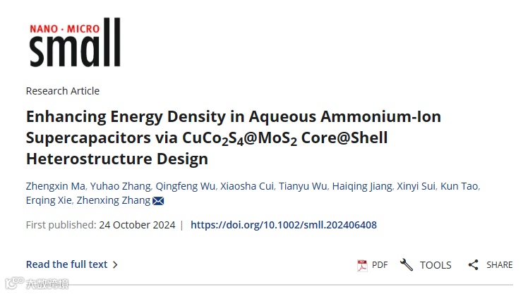 近日,来自兰州大学物理学院的张振兴教授课题组,在国际期刊Small上发表题为《Enhancing Energy Density in Aqueous Ammonium-Ion Supercapacitors via CuCo2S4@MoS2Core@Shell Heterostructure Design》的文章。本文构建了以CuCo2S4为核心,MoS2为壳层的CuCo2S4@MoS2Core@Shell异质结构,以提高水系铵超级电容器(AASCs)的能量密度。非原位表征表明,MoS2壳通过双电层电容机制发挥作用,丰富了NH4+离子的表面吸附,并使CuCo2S4结构内的离子嵌入/脱嵌成为可能。此外,研究得到了国家自然科学基金和甘肃省自然科学基金的支持,并分别利用兰州大学的超级计算中心和电子显微镜中心进行计算和表征。