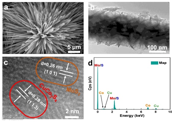图1. 微观结构表征。(a)CuCo2S4的SEM图像;(b)TEM图像;(c)HR-TEM图像;(d)CuCo2S4@MoS2的EDS光谱。