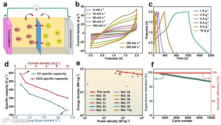 图5. CuCo2S4@MoS2//AC AASC的电化学性能。(a)器件原理图;(b-c)CV和GCD曲线;(d)比容量随扫速和电流密度变化的关系曲线图;(e)能量密度和功率密度的文献对比图;(f)在10 A g-1下循环性能。