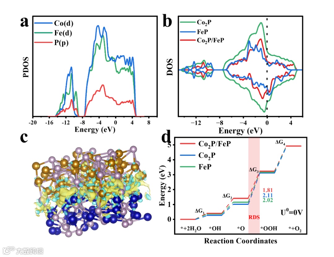 基于Co2P/FeP纳米片模型的密度泛函理论(DFT)计算进一步证实了电子在纳米片上的重新分布,结果显示,Co-3d和Fe-3d能带与P-3p能带匹配良好,表明系统中存在d–d和p–d相互作用,磷化后非均匀电荷分布加强。磷取代后,Co和Fe位点的d带中心向费米能级靠近,界面间电子耦合效应强,结构电子调制明显。模拟分析表明,在碱性条件下,OER过程中,*OOH的形成是速率决定步骤,Co2P/FeP纳米片模型上的吉布斯自由能垒(ΔG)为1.81 eV,低于Co2P和FeP模型的能量垒,说明磷化引起的电子重新分布和优化的d带能量水平有利于降低反应的ΔG,显著促进了OER过程的反应动力学。