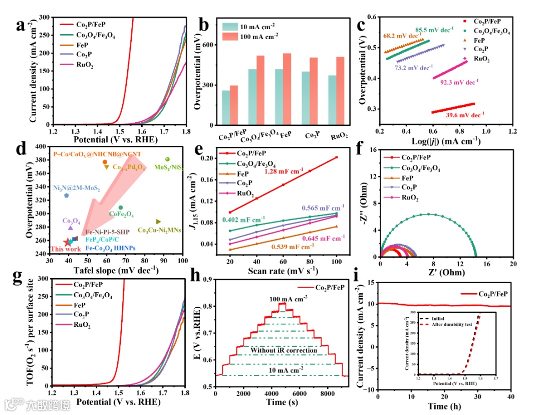 在碱性条件下,评估了Co2P/FeP纳米片对OER的电催化活性。结果显示,Co2P/FeP纳米片在10 mA cm⁻²的电流密度下,过电位为257 mV,Tafel斜率为39.6 mV dec⁻¹,表明双金属磷酸盐能加速OER反应动力学。LSV曲线归一化到TOF后显示Co2P/FeP纳米片的OER活性最高。稳定性测试表明,Co2P/FeP纳米片在长时间运行中表现出卓越的耐久性和快速的质量传输性能。此外,碳层的存在显著提高了催化剂的长期稳定性,样品在40小时连续运行后保持了约95%的初始活性。这些结果表明,碳层在提升过渡金属磷化物基催化剂的整体性能和稳定性方面起着关键作用。