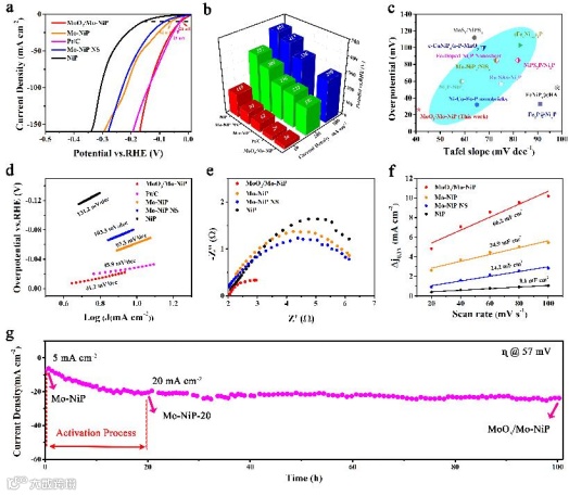 重构后的MoO₃/Mo-NiP/NF催化剂在碱性条件下表现出优异的HER性能,分别在26 mV和290 mV的超低过电位下实现了10 mA cm⁻²和500 mA cm⁻²的电流密度,并且具有长期稳定性。
