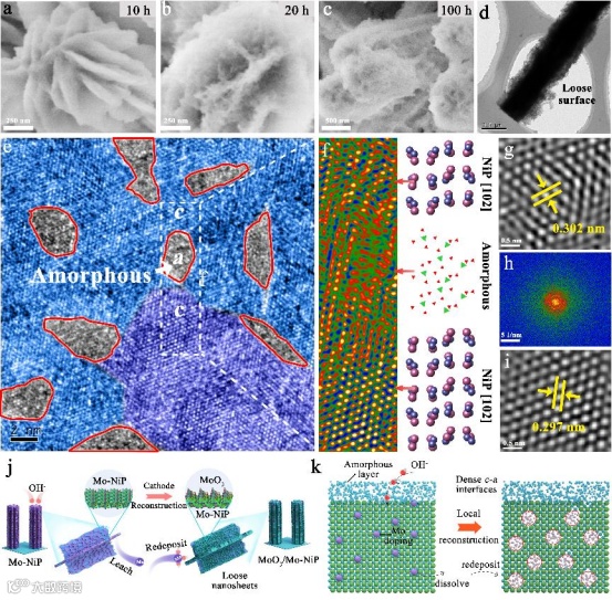 然而,要实现致密的c-a界面以最大化协同效应并提升HER性能仍然面临挑战,主要原因是两种异质相的成核和生长不同步。电化学重构在碱性电催化过程中广泛存在,自发生成非晶氧化物或氢氧化物,这为形成c-a异质界面提供了一种节能高效的途径。通常情况下,这种重构仅发生在近表面区域,导致形成具有稀疏c-a界面的核-壳结构(图1a)。然而,由于活性位点暴露不足、质量活性低以及界面协同效应较小,稀疏的c-a界面对于提高催化活性的影响有限(图1b)。因此,合理设计重构过程以实现致密的c-a纳米界面,进而增强HER性能,是一个既有前景又具挑战性的课题。