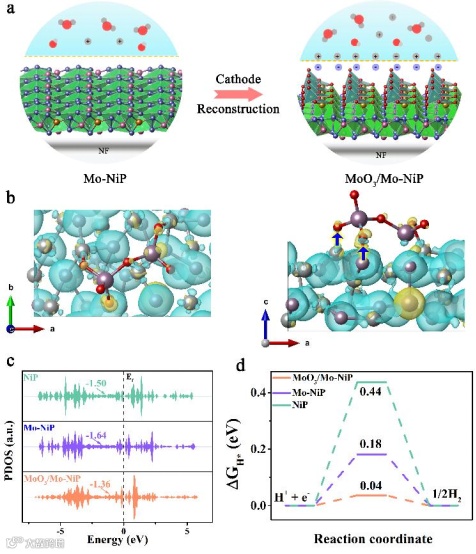 通过密度泛函理论(DFT)计算和实验证实,MoO₃/Mo-NiP/NF在碱性溶液中的高HER催化活性源于丰富的c-a界面。这些界面有效调节了电子结构,增强了表面质子富集,形成了局部酸性微环境。