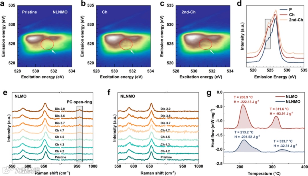 通过结合mRIXS、原位拉曼光谱和DSC表征,明确展示了阴离子还原反应及其衍生的副反应的演变过程,清楚地揭示了高价态Nb掺杂策略可以有效地稳定本征氧空位环境并抑制NLNMO中的阴离子还原介导的氧空位,从而实现阴离子还原行为的高稳定性并抑制不利的结构降解。