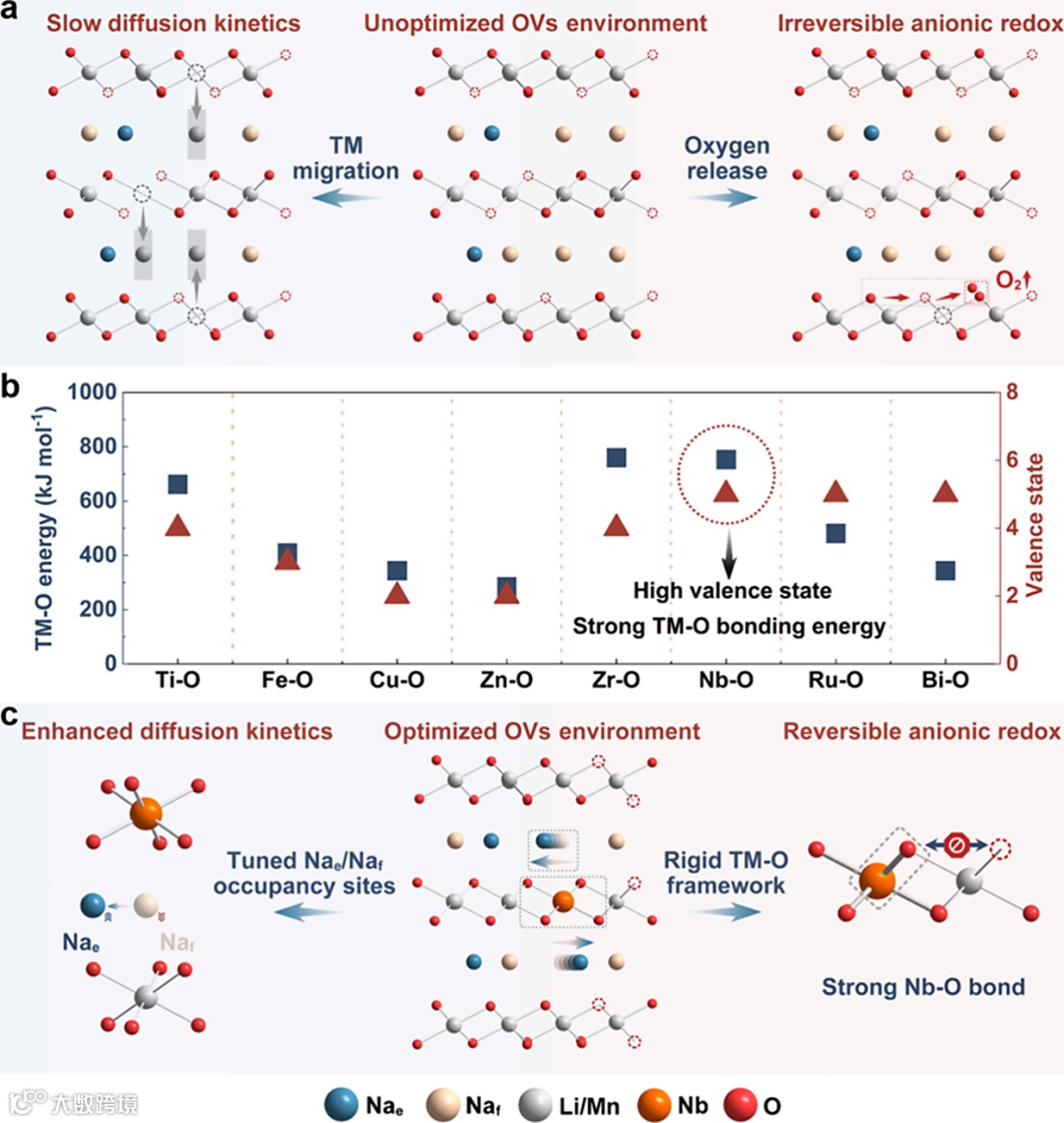 基于此,苏州大学张亮团队在国际知名期刊ACS Nano上发表题为“Stabilized Oxygen Vacancy Chemistry toward High-Performance Layered Oxide Cathodes for Sodium-Ion Batteries”的观点文章。该文章揭示了阴离子氧化还原介导的氧空位与本征氧空位之间的强烈相互作用,并证明在TMO2层中存在本征氧空位时,会降低过渡金属-氧框架的完整性,并开启额外的扩散路径,从而触发阴离子氧化还原介导的氧空位的生成和迁移。通过引入高价态Nb5+,提出了一种氧空位稳定策略,它可以作为锚定氧亚晶格的重要构建模块,防止形成连续的氧空位迁移网络,从而抑制阴离子氧化还原介导的氧空位的形成/扩散。因此,实现了出色的结构稳定性和可逆阴离子还原氧化反应。这项工作深化了我们对利用阴离子还原氧化开发高性能能源存储系统的理解。