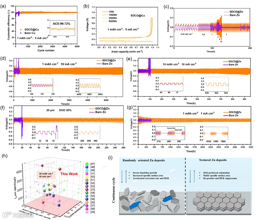 SDCD界面能够显著提高锌负极的稳定性和可逆性:SDCD@Cu的不对称电池能够稳定运行近5000次循环,平均库仑效率高达99.72%;对称电池在1 mAh cm-2,10 mA cm-2的快充条件下展现出了5800 h的超长循环稳定性;使用20μm薄锌箔进行了循环测试。当放电深度(DOD)高达50%时,SDCD@Zn的循环寿命比裸锌对称电池延长了14倍。通过交替的运行(24 h)-静置(24 h)测量模式,在1 mA h cm-2和1 mA cm-2条件下对称电池能够稳定运行超过3500 h。这充分证明了超分子复合单元在抑制锌负极枝晶生长和腐蚀方面的有益作用。