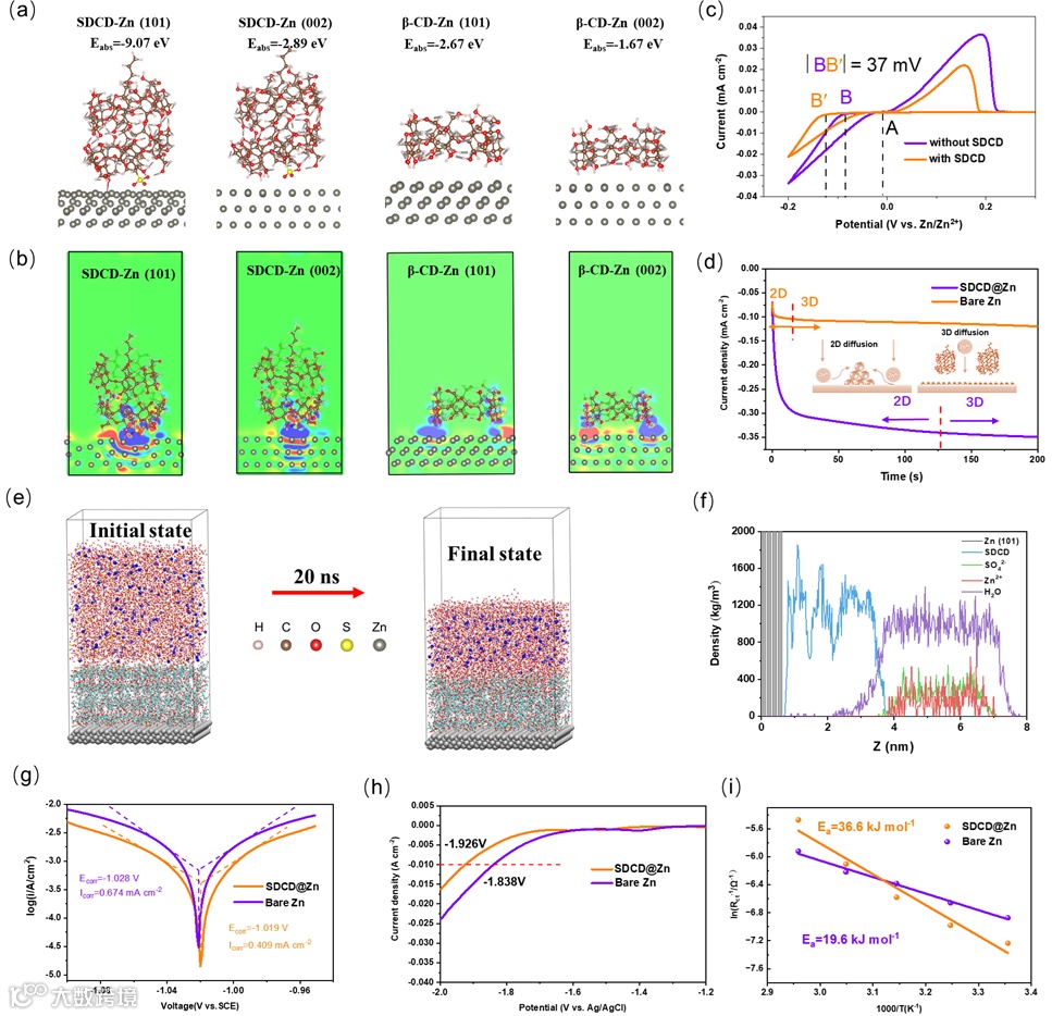 通过密度泛函理论(DFT)计算研究了SDCD和β-CD单元在不同锌晶面上的吸附能,证实了SDCD对晶体表面选择性吸附能力的增强,这主要归因于β-CD的羟基与客体分子中磺酸基团的协同作用。进一步通过分子动力学(MD)模拟及一系列实验,深入地分析了SDCD在界面处的电化学行为,发现其不仅能有效抑制副反应,还有利于Zn²⁺通量的均匀化并减缓Zn²⁺迁移速率,最终形成均匀的锌沉积。