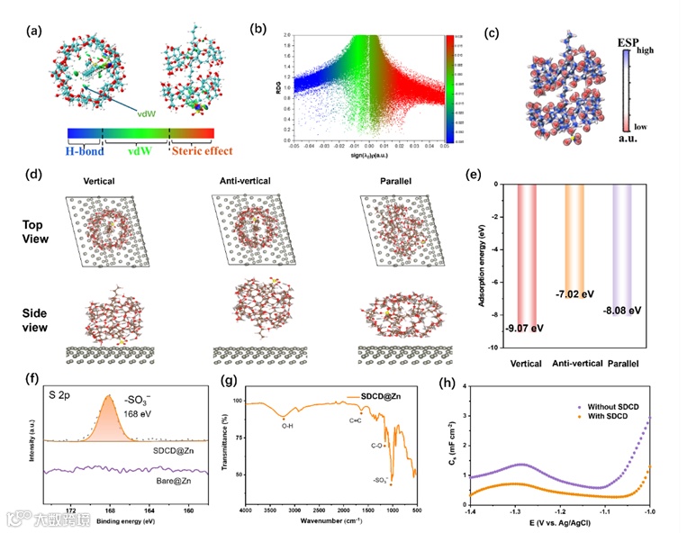 (a) IGM分析; (b) sign (λ2)ρ等值面;(c) 静电势图;(d, e) 吸附构型以及相应的吸附能;(f) XPS图谱;(g) 红外光谱;(h) 界面微分电容。