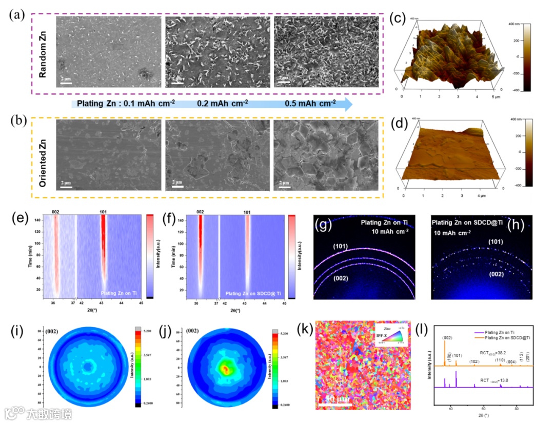 (a,b) 锌沉积形貌演变情况。(c, d) 沉积锌表面AFM图。(e, f) 锌沉积过程的原位XRD图谱。(g, h) 2D XRD图。(I, j) 锌(002)晶面极图。(k) EBSD图。(l) XRD图谱。