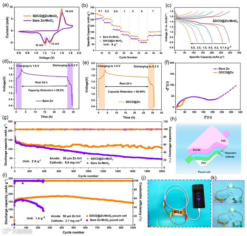 (a) CV曲线。(b, c) 倍率性能及相应的充放电曲线。(d-f) 全电池静置24 h容量保持率及相应的EIS。(g) 长期循环稳定性。(h) 大尺寸锌负极的软包电池示意图。(i) 软包循环性能。(j, k) 实物演示图。
