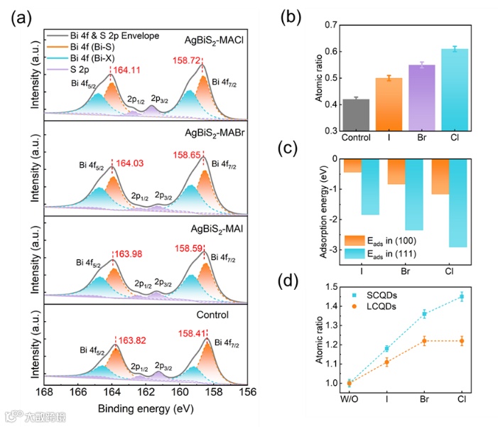 图2. AgBiS2胶体量子点的表面化学分析:a)对照样及AgBiS2-MAX薄膜(MA=甲基铵,X=I、Br和Cl)的Bi 4f 和S 2p X 射线光电子图谱。b)对照样及AgBiS2-MAX薄膜表面卤素与金属的原子比。c)卤素配体在AgBiS2胶体量子点(100)面和(111)面上的吸附能。d)经MAX后处理的大尺寸胶体量子点(LCQDs)和小尺寸胶体量子点(SCQDs)所制备薄膜中的卤素含量与各自未经后处理的薄膜中卤素含量的比值。